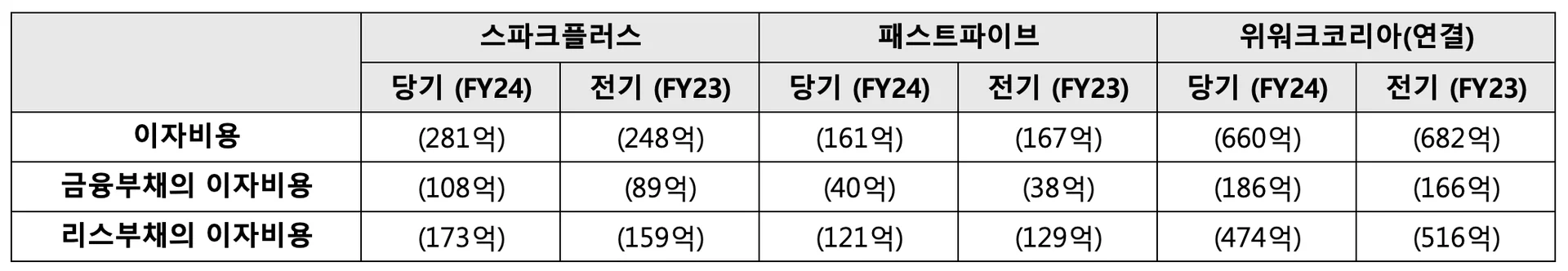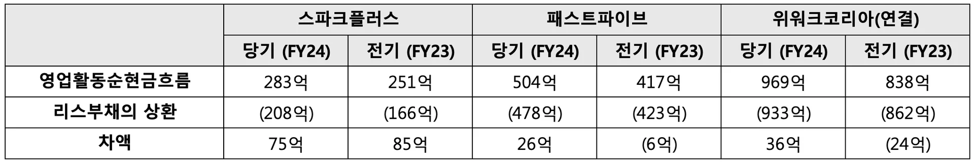 스파크플러스와 패스트파이브는 2024년 감사보고서의 별도재무제표를, 위워크코리아는 2024년 감사보고서의 연결재무제표를 사용했습니다. (패스트파이브는 공유오피스 이외의 사업을 영위하는 자회사만 존재하며, 위워크코리아는 자회사로 공유오피스 사업을 영위하는 ‘위워크서울1호~5호유한회사’와 ‘위워크부산1호유한회사’가 있습니다.)